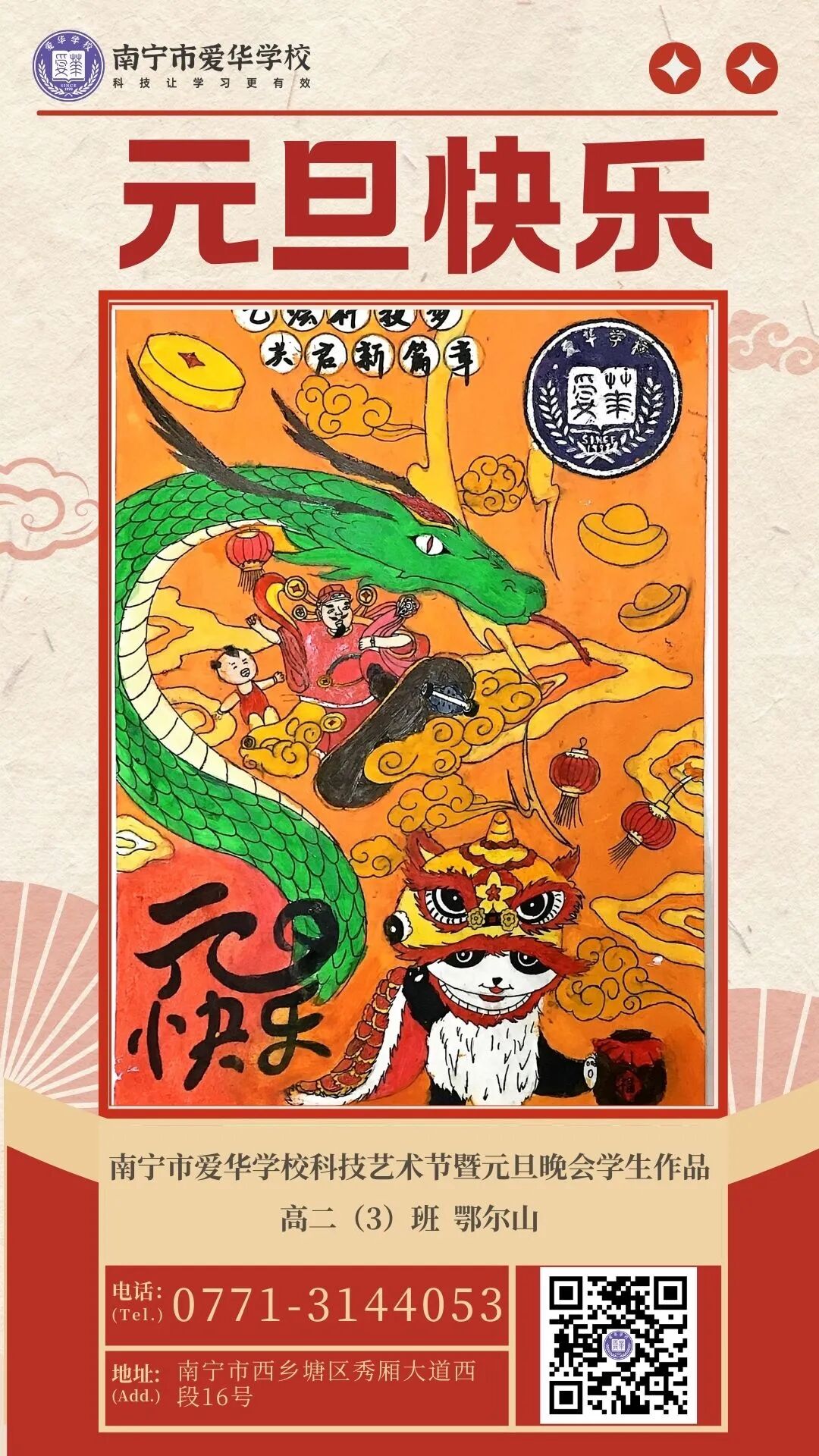 在12月举办的科技文化艺术节中,每个班精心创作一幅属于自己的新春海报,每一幅海报都是孩子们创意的结晶。我们选取4幅优秀作品作为代表,作为传递祝福的使者,向全国人民致以最诚挚的元旦快乐之愿!