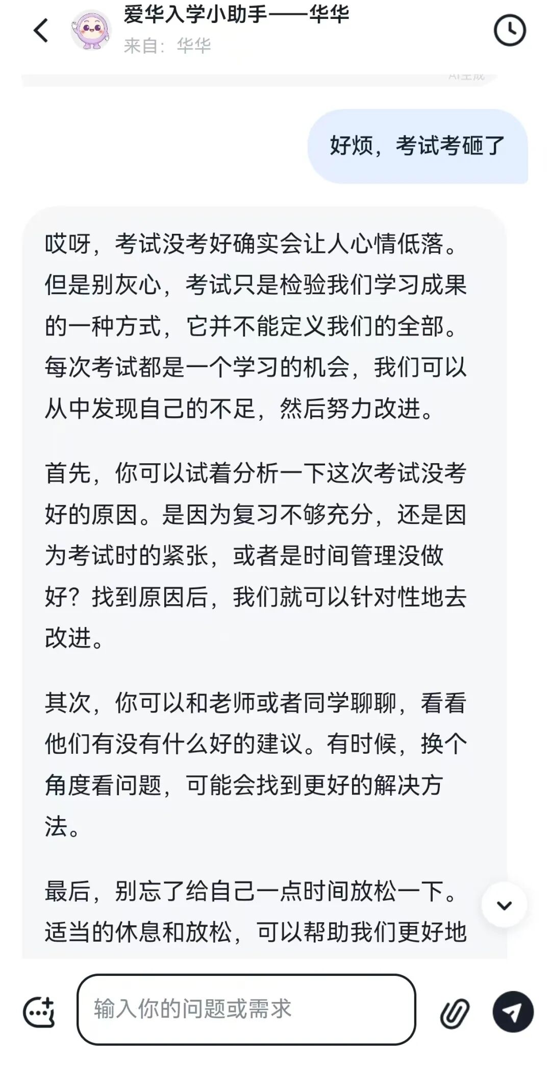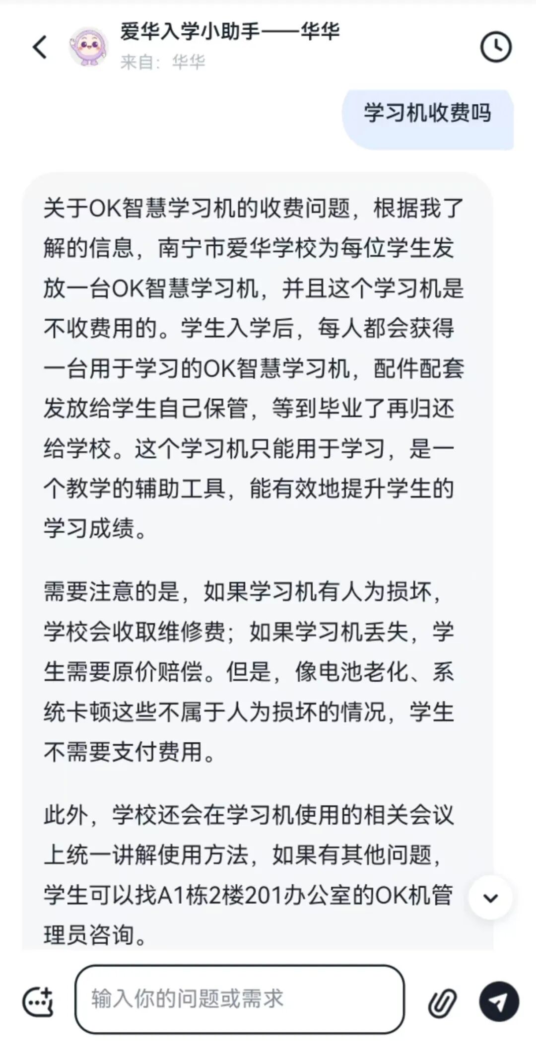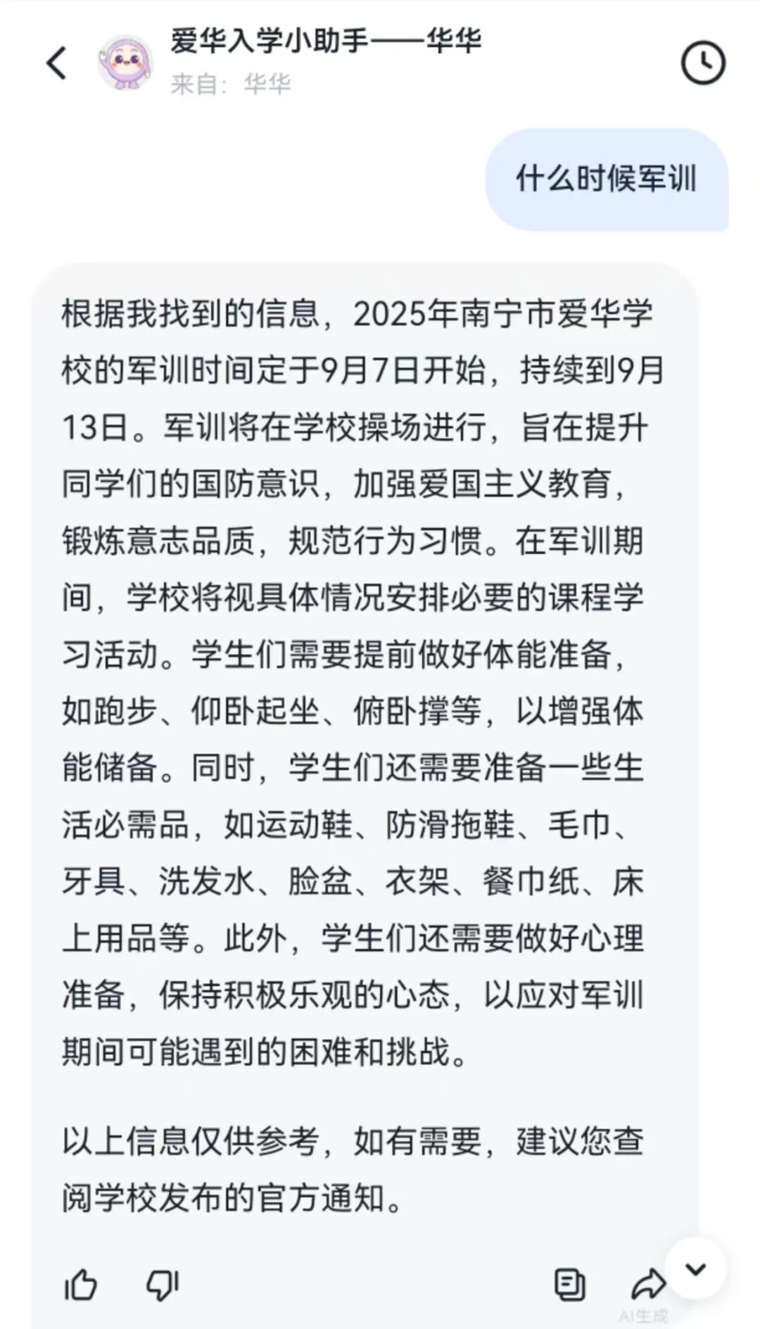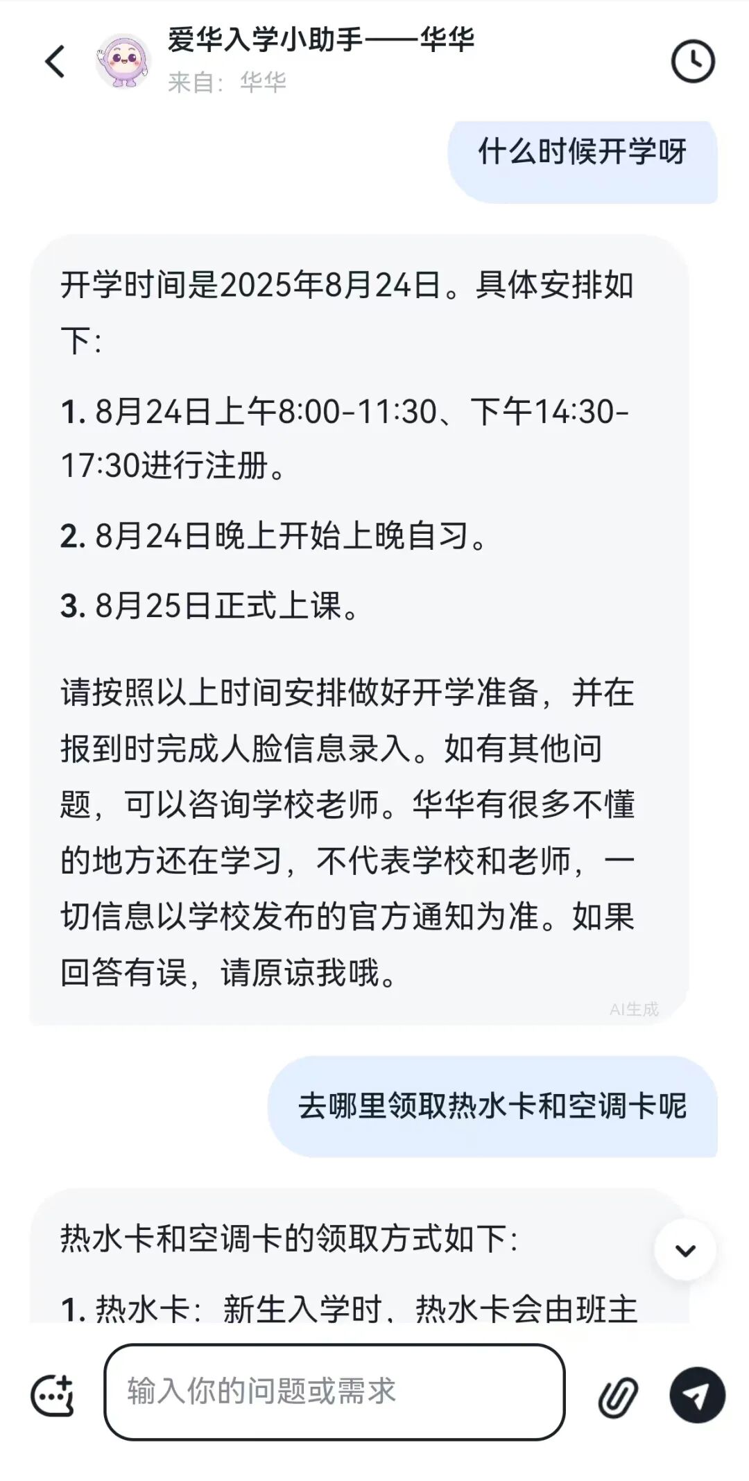 假期中,我们收到许多关于报到流程、宿舍安排、开学考、物品准备等问题的咨询。为了让大家随时随地获取准确答案,学校组织老师结合高频疑问,开发了 AI入学小助手 “华华”