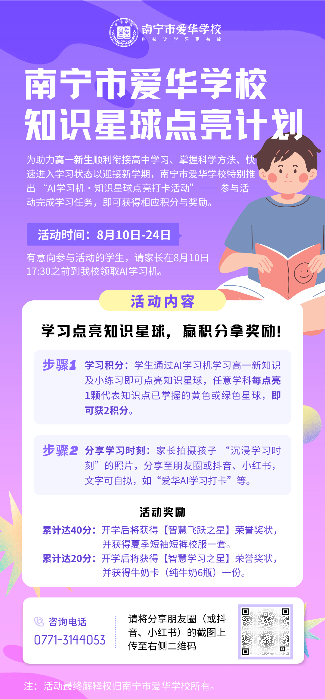 初升高是学业生涯的重要转折点!为帮助同学们顺利衔接高中学习、掌握科学方法、快速进入学习状态,以最佳姿态迎接崭新的高中生活,南宁市爱华学校特别推出 “AI学习机·知识星球点亮打卡活动”!参与即有收获,坚持更有惊喜!