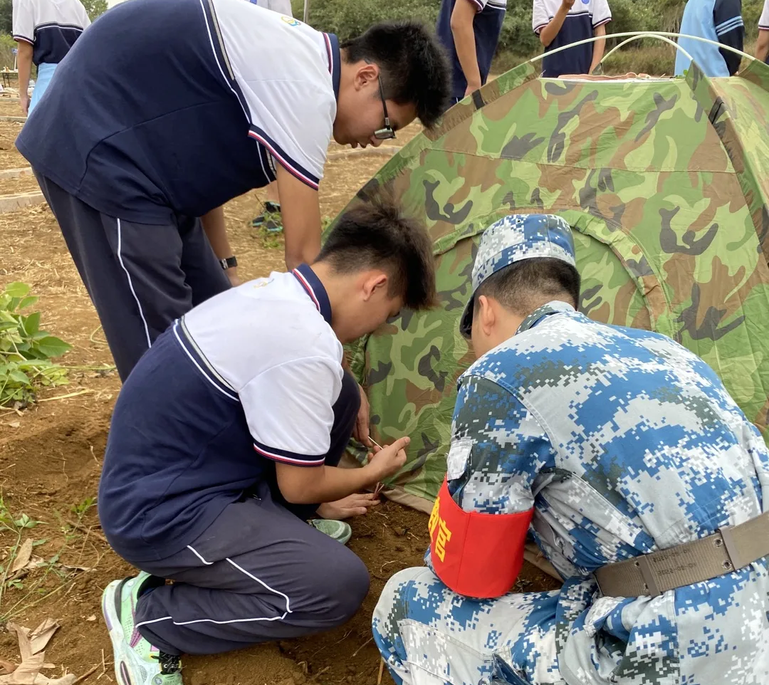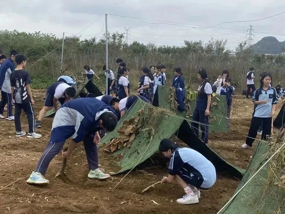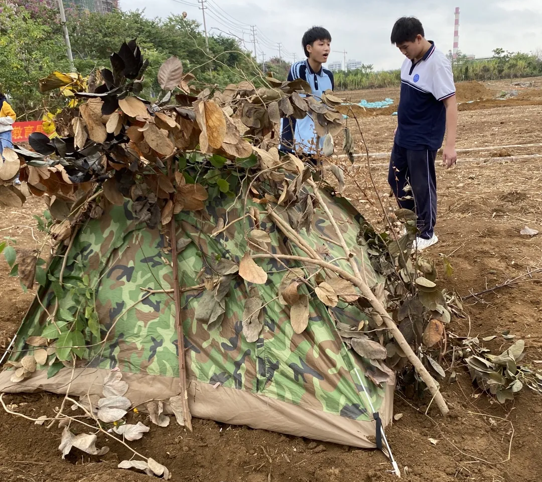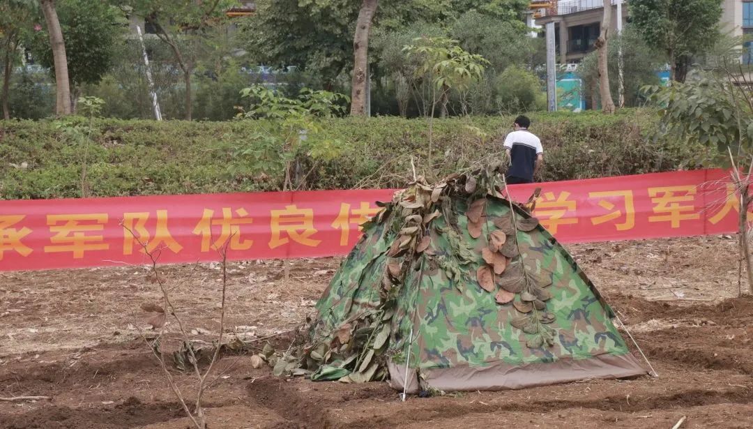 接下来我们按小组,领取了铲子、木棍等工具进行实操。根据学到的内容,挖排水沟,搭建帐篷并且进行掩护,我们分工合作,有的挖沟,有的搭帐篷,有的去旁边树林寻找掩护物。一滴滴汗水落下,一铲铲不停工作,你累了换我上,我累了他顶上,没有人退出放弃,齐心协力完成任务。